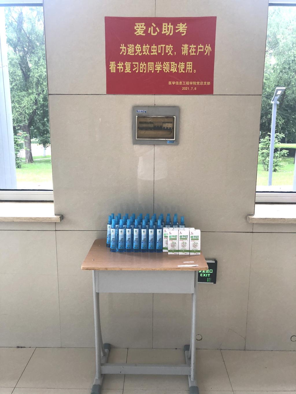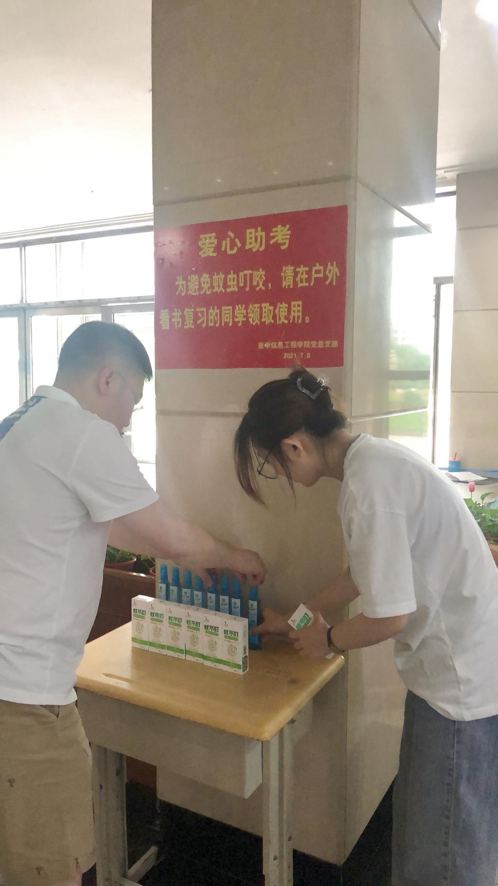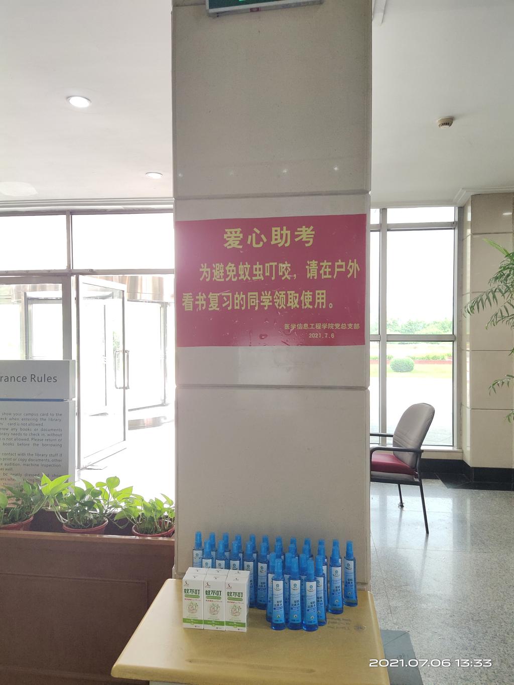 为了帮助期末备考的学生更好地复习,allwincity万象城党总支部继续开展“践行初心,爱心助考”活动,7月6日,为在户外看书的同学们提供便携式驱蚊花露水,分别放置在致远楼一楼、图书馆一楼大厅,方便学生领取使用。