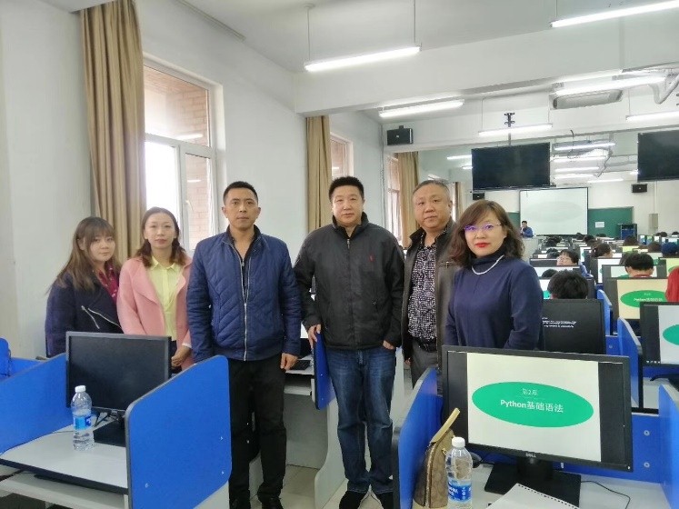 最后,娄教授带着我们到实验课程中心的计算机机房,现场观摩了正在机房讲授Python课的曹老师的一节教学课,身临其境的体会了一次机房授课的教学模式,给我们留下了深刻的印象。