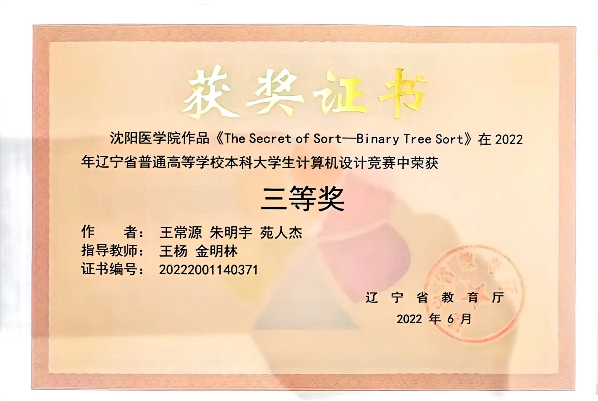 在大学生设计大赛中,我院学生团队的作品《The secret of sort - binary tree sort》荣获辽宁省大学生计算机设计大赛三等奖、中国大学生计算机设计大赛三等奖。 在这场激烈的竞争中,我们不仅展示了过硬的技术实力,更传递出了科学探索的精神和团队协作的力量。从项目构思到算法实现,再到现场展示,每一个环节都凝聚了团队成员无数个日夜的辛勤努力和智慧结晶。